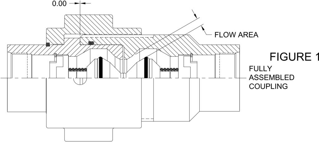 Less than full assembly of the coupler and nipple assemblies will have a detrimental effect on coupling performance and possibly the associated components. In a fully assembled coupling, the valves are restricted by the valve guides to a few thousand’s inch of axial movement. Refer to Figure 1. Note the large fluid flow area this condition provides.