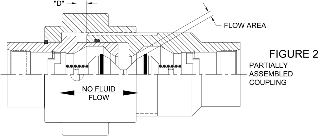 In a partially assembled coupling with sufficient flow forces, the valves ill shift downstream and come to rest on the downstream valve guide. This causes the upstream valve to approach its’ seat. Refer to Figure 3. Note the drastically reduced fluid flow area in this condition. As distance “D” approaches that necessary to close the upstream valve, the pressure drop across that valve will become excessive. This pressure drop results in significant forces being generated which are imparted to the downstream valve guide. Under the right conditions, these forces can cause mechanical damage up to and including failure of the downstream valve guide.